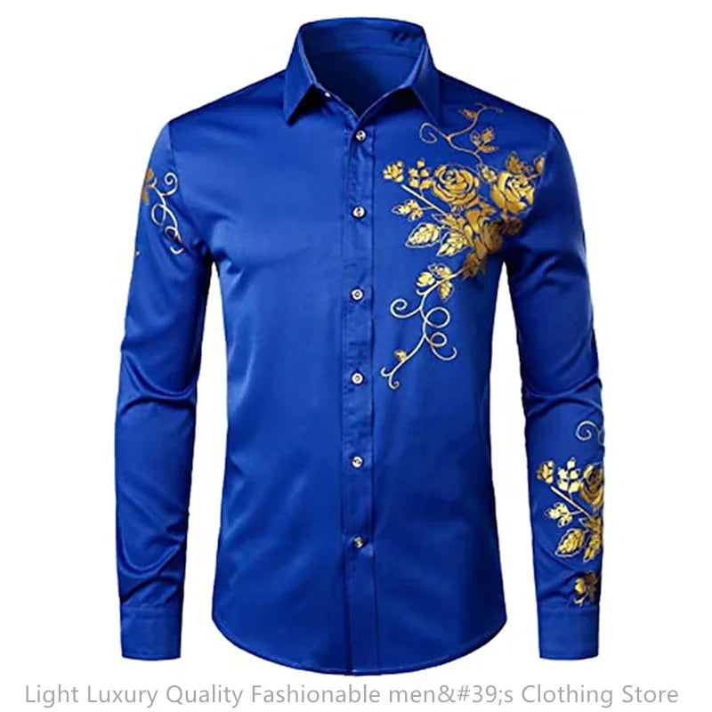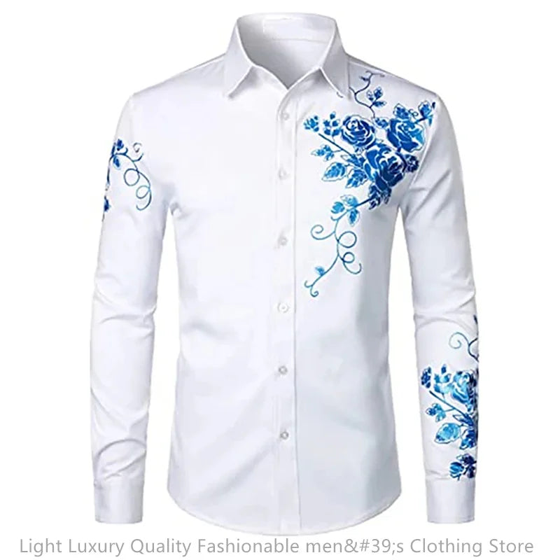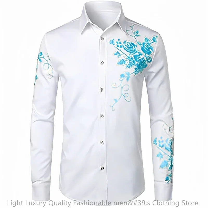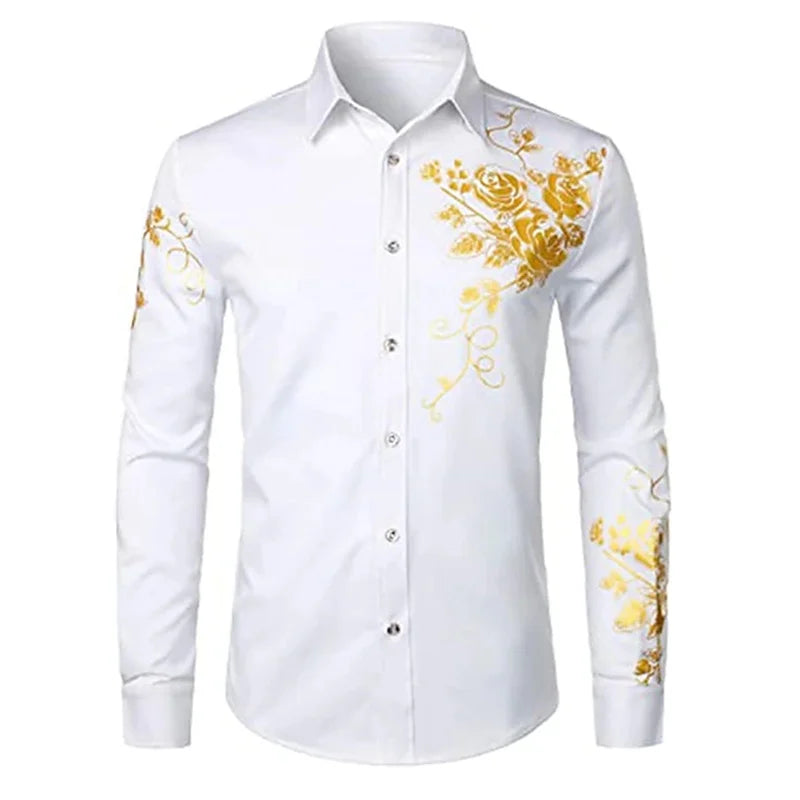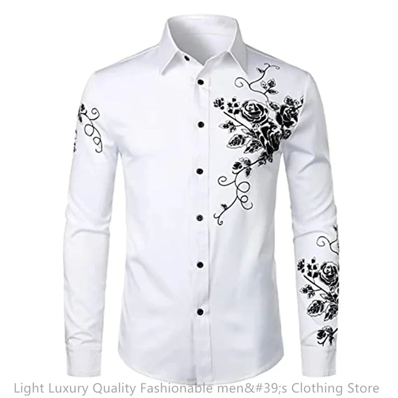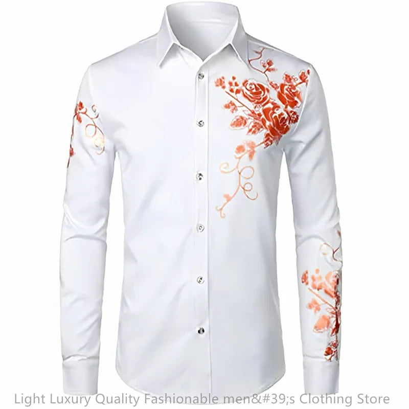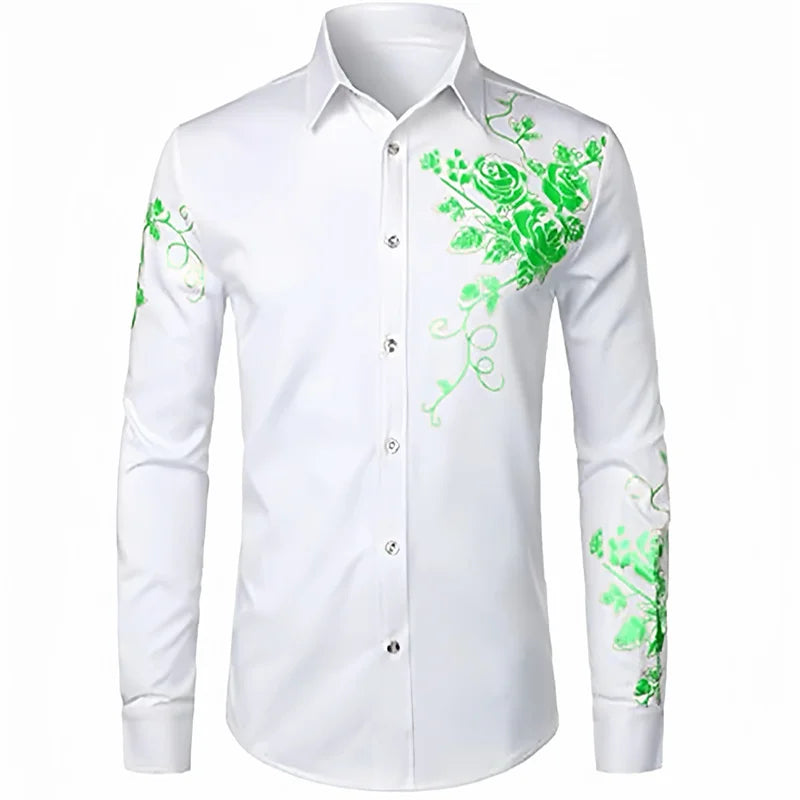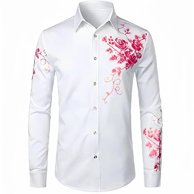 Featuring a striking floral embroidery that flows gracefully across the shoulder, chest, and sleeve, the Ornate Rose displays a vivid rose-inspired design that adds a bold artistic flair, perfectly blending modern fashion with classic romanticism. The striking contrast of each unique blooms against crisp polyester creates an eye-catching look that exudes charm, creativity, and confidence. Tailored to hug the body in all the right places, this shirt is perfect for formal gatherings, romantic evenings, or any time you want to turn ordinary moments into unforgettable impressions.