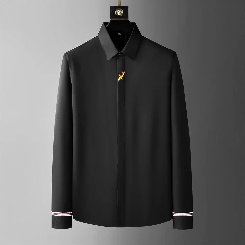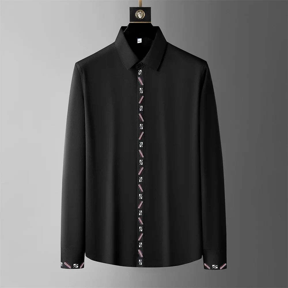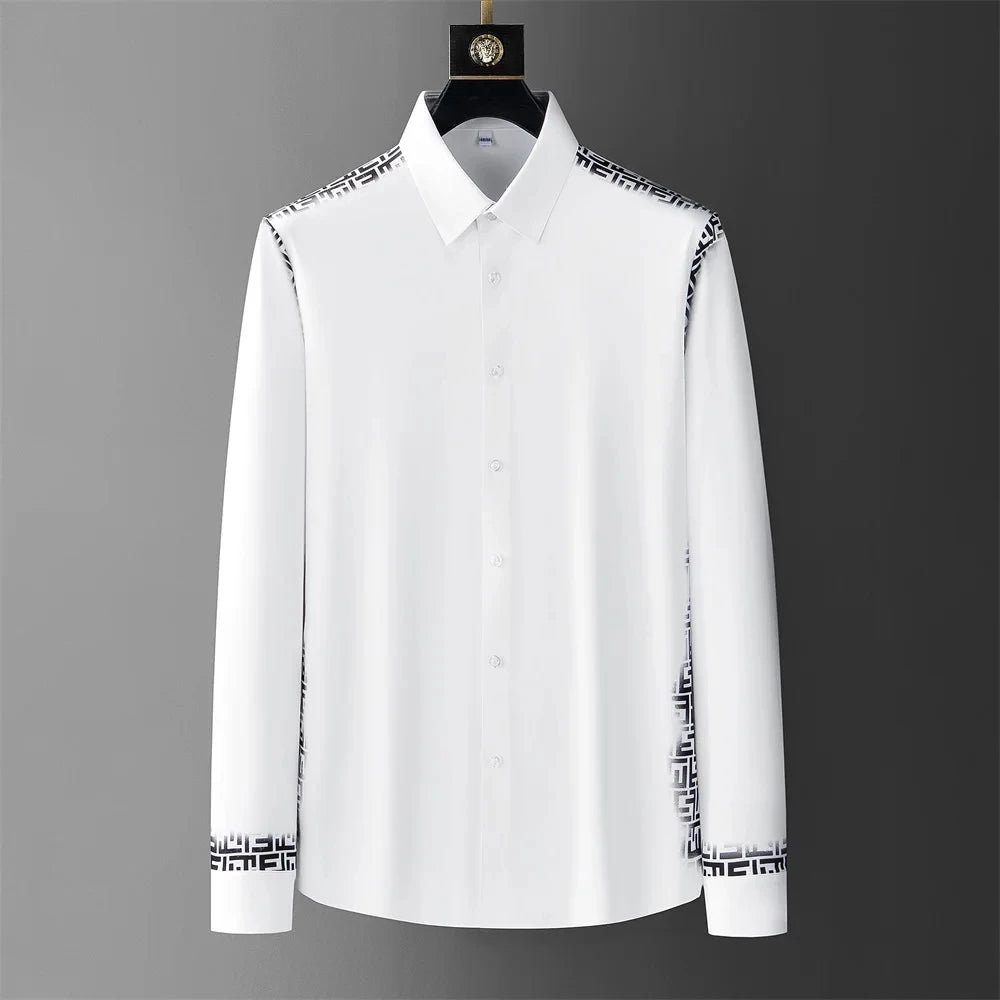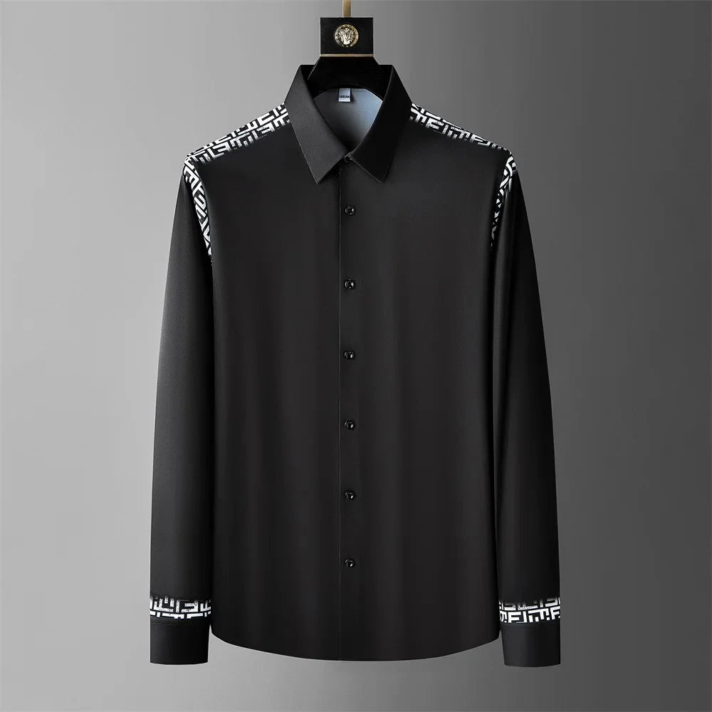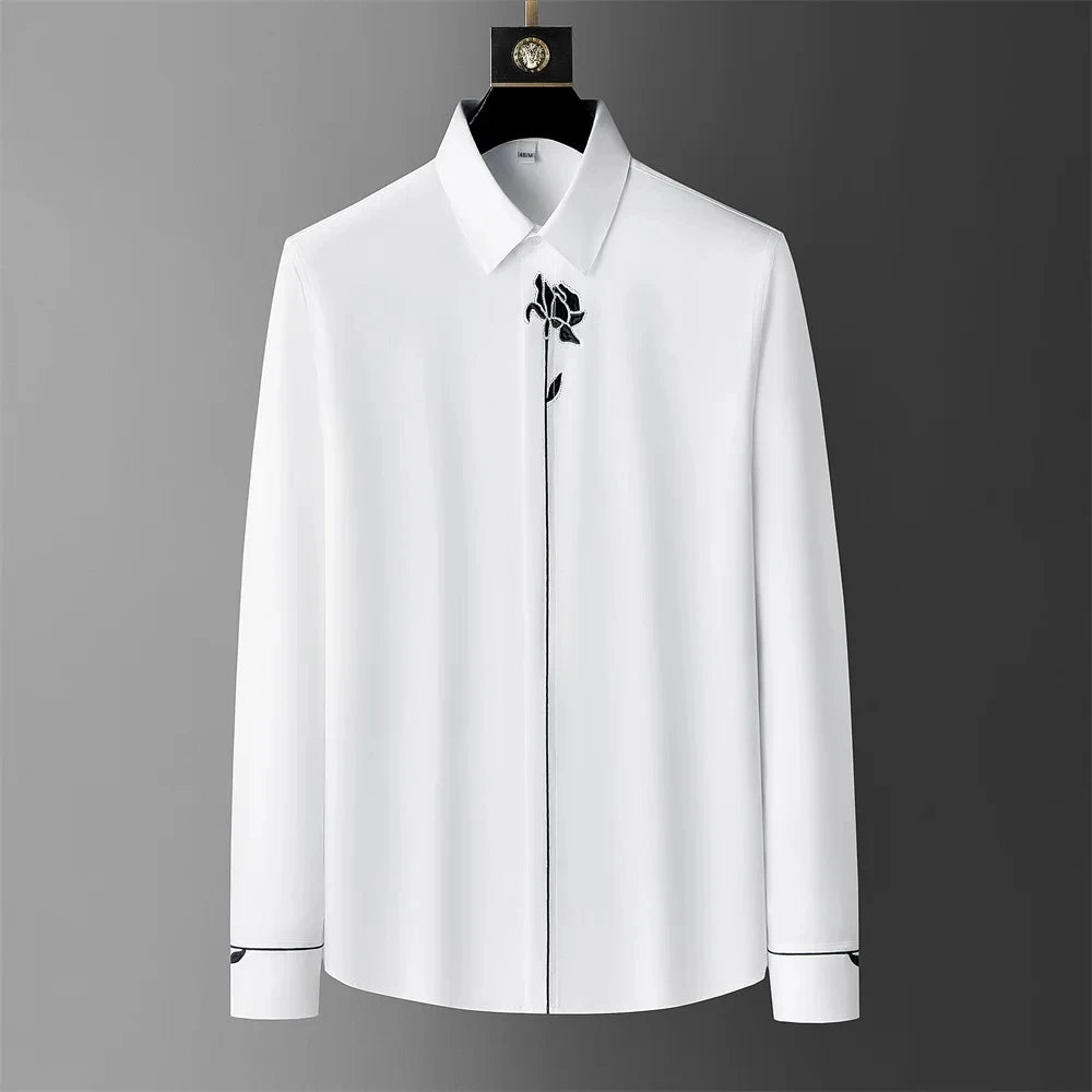 The crisp white and black design of the Ivory Architect blends minimalist sophistication with bold geometric edge. The standout feature? Striking black patterned panels on the shoulders that form a sharp, modern contrast as well as a second design of a minimalist rose delicately embroidered near the collar that adds a touch of quiet rebellion to its clean silhouette. With sleek piping tracing the cuffs and placket, this polyester and spandex shirt whispers sophistication while making a lasting impression. —making this shirt far from ordinary. Perfect for those who appreciate clean lines and high fashion, it effortlessly shifts from boardroom-ready to evening-out bold. This isn't just a shirt—it's a statement of precision, class, and confidence.