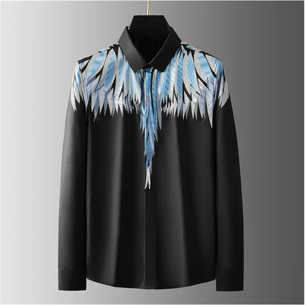 Unleash your inner style icon with this bold and breathtaking white shirt, accented by an electric burst of blue feather-inspired detailing that cascades from the shoulders like wings ready to take flight. The striking contrast between the crisp white fabric and the vivid, dynamic design makes this shirt an instant conversation starter even with our second variant which commands attention with the striking white or black background, featuring a bold vertical gold stripe and a cleverly embedded “FEND” typography that exudes contemporary edge. The sleek design uses polyester and spandex that transforms minimalism into a statement, offering the perfect balance of luxury and street-style sophistication. The Skyborne Elegance is perfect for events where making an impression is non-negotiable, this piece fuses artistic flair with refined tailoring to deliver a look that’s both daring and sophisticated. Wear it, and let your confidence soar.