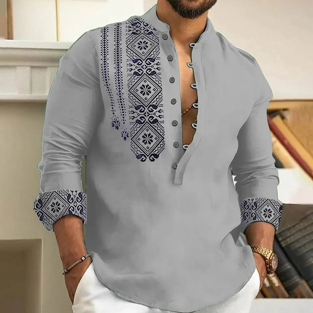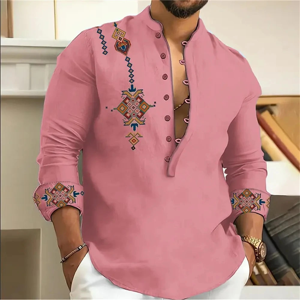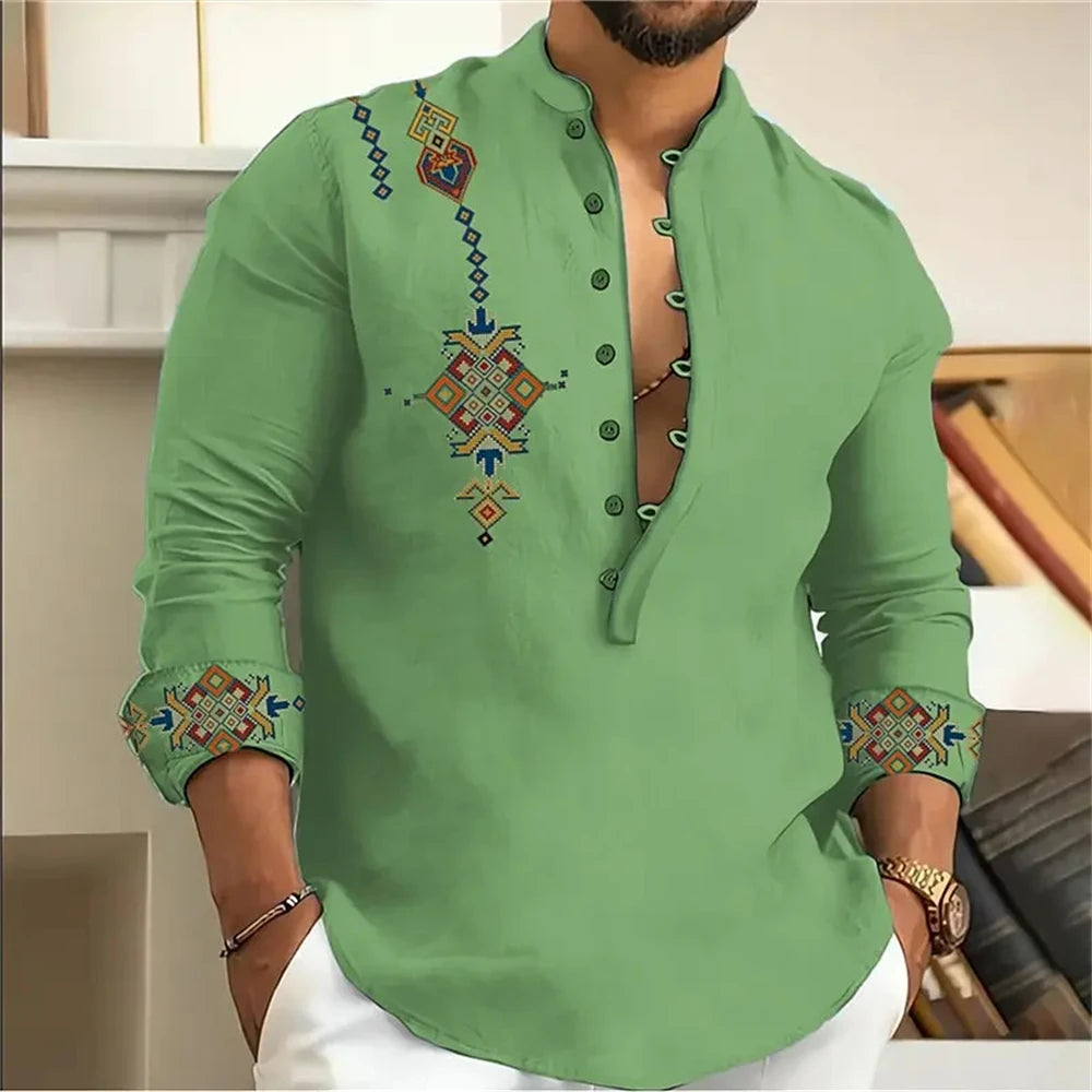 Imperial African Crest is uniquely designed with intricate geometric embroidery that adds a bold, cultural edge to your look. The detailed precision on the chest and cuffs gives it a refined, handcrafted appearance, making it perfect for both casual sophistication and stylish evening wear. The deep neckline with polyester, linen and spandex adds a touch of modern flair while allowing breathability and comfort. Whether you're stepping out for a dinner date or a festive gathering, this shirt ensures you stand out with effortless elegance and masculine charm.